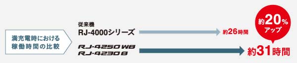 3,000mAhの大容量リチウムイオン充電池を採用。 印刷待機時の稼働時間*1は従来機(RJ-4000シリーズ+PA-BT-4000LI)と比較して約20%長い約31時間を実現。 屋内での運用にも安心してご利用いただけます。 また最高127?/秒*2の高速印刷なので、大量印刷にも適しており、業務の効率化に役立ちます。 |